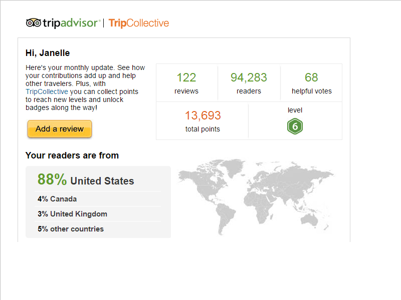 Tripadvisor makes it fun to write reviews with their digital badge collection and ranking systems. Apparently I am the #4
